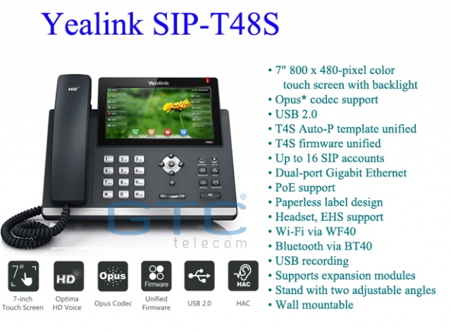 Điện thoại IP SIP-T48S là một giải pháp truyền thông kinh doanh năng động cho các giám đốc điều hành và các chuyên gia. Điện thoại này cung cấp một màn hình cảm ứng lớn giúp chuyển đổi giữa các trang và các ứng dụng nhanh chóng, dễ dàng và thuận tiện. SIP-T48S cũng có công nghệ Optimal HD Voice của Yealink và codec băng rộng của Opus cho âm thanh rõ nét. Người sử dụng điện thoại sẽ nghĩ rằng họ đang ngồi trong cùng một phòng với nhau. Điện thoại sử dụng công nghệ Gigabit Ethernet để xử lý cuộc gọi nhanh. Thêm vào đó, nó hoạt động kết hợp với USB Dongle USB và USB Dongle Wi-Fi. Dòng T4S mới cung cấp sự xuất hiện thanh lịch của dòng T4, nhưng với những cải tiến cho khả năng tương tác và cộng tác tốt hơn.