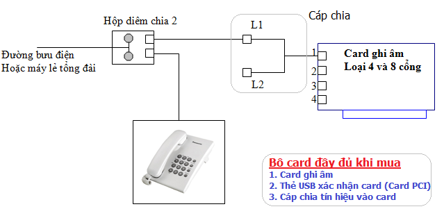 Card ghi âm này ta nối song song với đường điện thoại cần ghi âm và hình nối như sau.