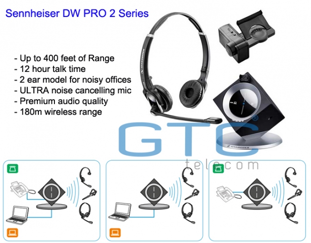 Tai nghe Sennheiser DW Pro2 tương thích với GAP tai nghe có thể được ghép nối với hầu hết các trạm cơ sở không dây và các tính năng công nghệ âm thanh ActiveGard bảo vệ chống lại cú sốc âm thanh và âm thanh đột ngột. Giao diện người dùng trực quan cho phép bạn tắt micrô và điều chỉnh âm lượng lên hoặc xuống. Tai nghe cũng có tính năng bùng nổ có thể điều chỉnh bằng micrô giảm tiếng ồn chất lượng cao giúp giữ cho tiếng ồn nền tối thiểu trong khi vẫn mang đến âm thanh trong trẻo.