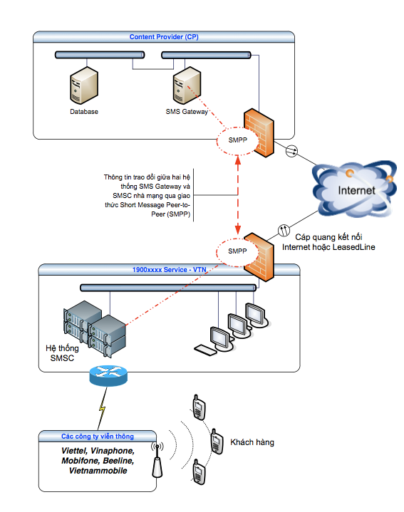 Để có thể cung cấp dịch vụ đến khách hàng (người sử dụng mobile), hệ thống cần được kết nối đến SMSC (SMS Center) của các mạng di động. Ở Việt nam hiện nay có 6 mạng di động được triển khai, dựa trên 2 chuẩn công nghệ cơ bản: